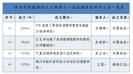 我院古雅辉、朱培彰、咸云龙和王慧等四位教师的论文入围本届体育科学大会。其中古雅辉的《PCK视域下职前体育教师教育实践能力培养研究》、朱培彰的《文化学视域下体育新课程教学的困惑及纾解路径》和咸云龙的《宁夏回族传统体育口述史研究》进行了专题报告,王慧的《银川市城市居民体力活动状况调查研究》进行了墙报交流,这是我院自参加体育科学大会以来,取得的最好成绩!