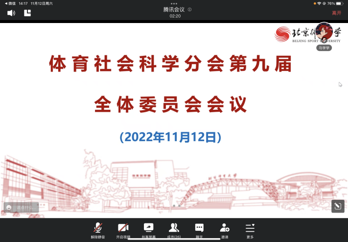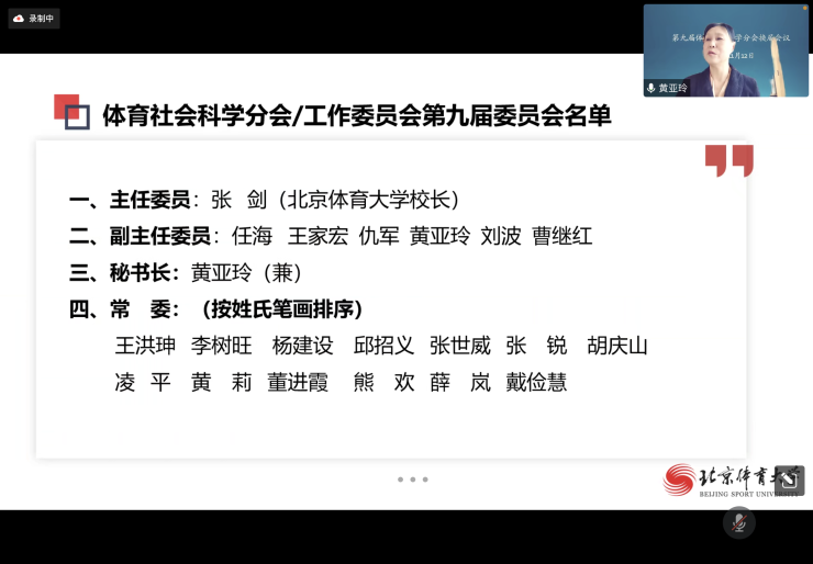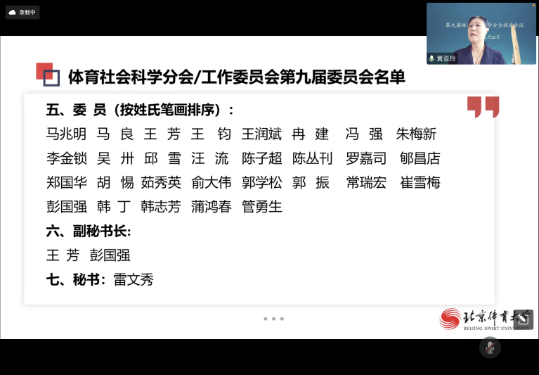 2022年11月12日,中国体育学会体育社会分会第九届全体委员会会议及换届会议以在线会议在北京召开。北京体育大学校长张剑出席会议并讲话,体育社会科学分会第九届委员及会员代表48人参加,会议由副主任委员兼秘书长北京体育大学教授、博士导师黄亚玲教授主持。