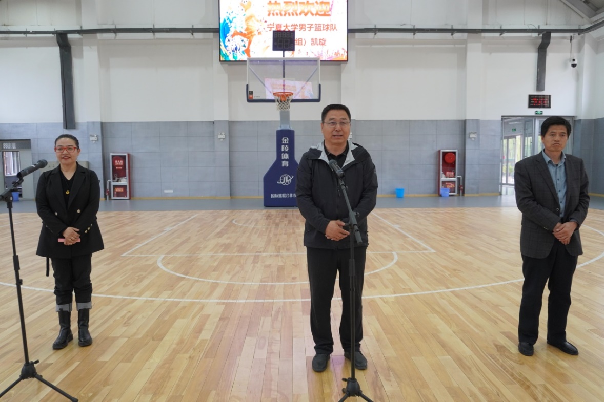 欢迎仪式上,校体委副主任、william威廉英国院长咸云龙致欢迎词。他表示,本次williamhill英国男子阳光组篮球队首次走出“家门”参加CUBA中国大学生篮球二级联赛,能够进入北区十二强,实现历史性突破,首先要感谢学校和各学院领导对大学体育工作的关心重视、政策支持、场地保障和人文关怀,其次要感谢领队、教练员的辛勤付出和队员们的奋力拼搏。