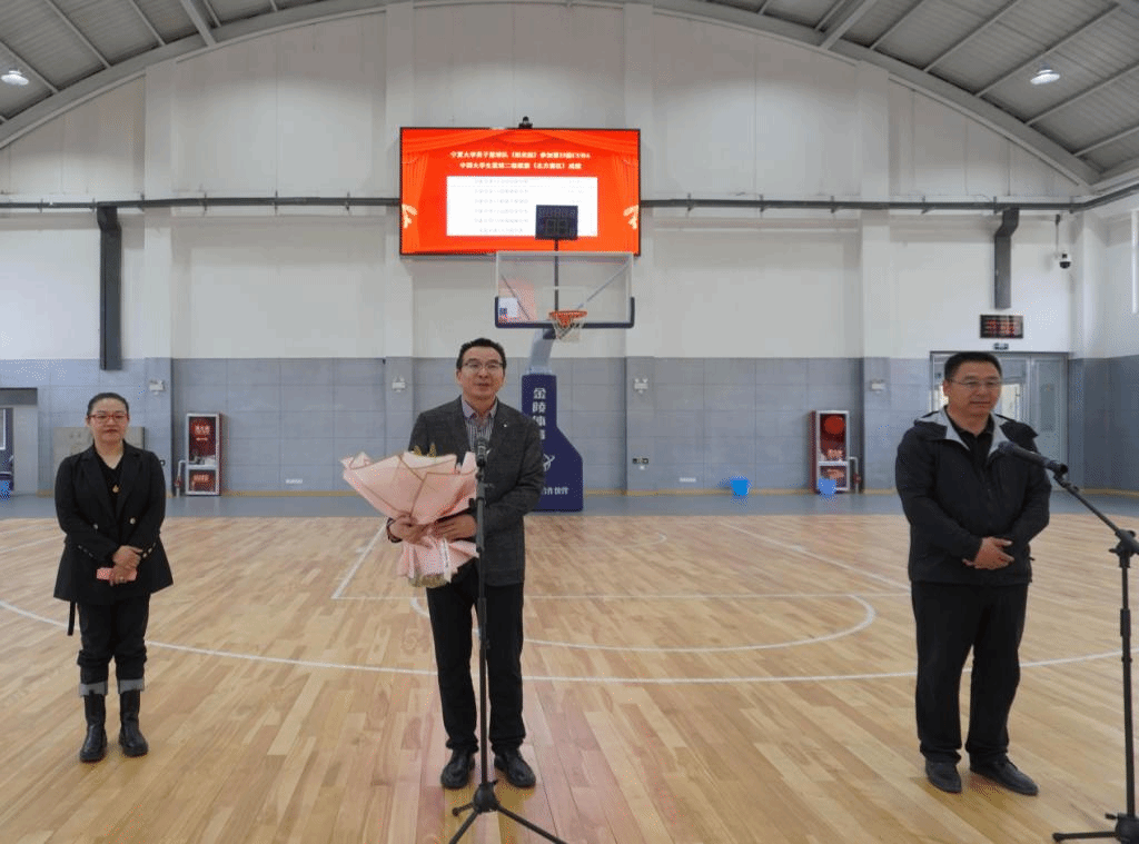 williamhill英国男子阳光组篮球队队长丁奎山(来自物理与电子电器工程学院)代表全体队员发言,他表示:首先感谢学校领导对男子阳光组篮球队的信任与支持,让我们有机会代表williamhill英国参加本次CUBA中国大学生篮球二级联赛北区比赛。在赛场上,我们展现了宁大学子敢于争先、永不言败的风貌。还要感谢领队、教练和队友们的辛勤付出。本次参赛经历在我们的学习生活中留下了浓墨重彩的一笔,我们会继续努力训练,争取在今后的各项比赛中为学校争得更多荣誉。