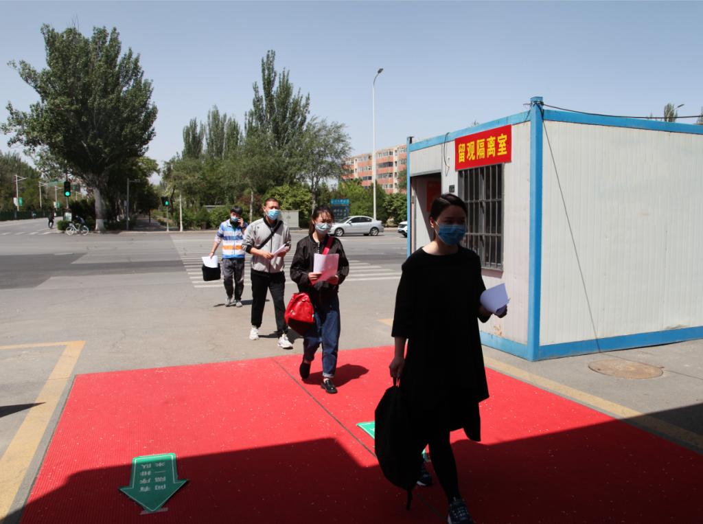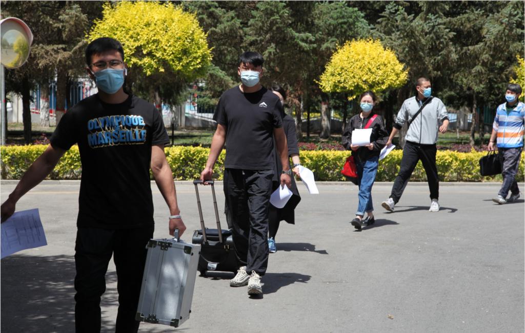 宿舍管理人员等候在1#学生公寓门口,准备迎接返校学生。在宿管人员和各位辅导员的耐心指导下,经过测温、消毒、换戴新口罩一系列严谨有序操作后,学生按照提前分配的宿舍名单有序入住,并及时向家人传达安全返校消息。