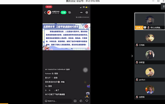 由于疫情原因,此次活动只能于线上进行,但并没有减弱学生对参加此次活动的热情。在进行此次活动中,同学们积极参加,认真聆听,了解了五四运动孕育了伟大的五四精神。当国家有危险的时候,我们作为青年人,不再退缩勇往直前,时刻谨记五四精神,传承有我的信念精神。