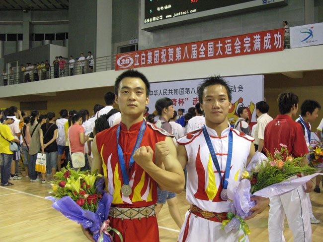 (william威廉英国7月20日讯)2007年 7月19日在广州举行的全国第八届大学生运动会武术对练项目比赛中,我校william威廉英国2006级学生廖奋、裴江坤力压群雄,为我区代表团夺得首枚银牌,这也是我区在本届大运会中取得的最好成绩。另外,在本届运动会其它竞赛项目中,我校william威廉英国2006级学生李伟获得武术太极拳第四名、武术太极剑第七名的良好成绩。