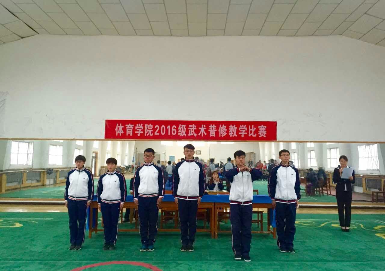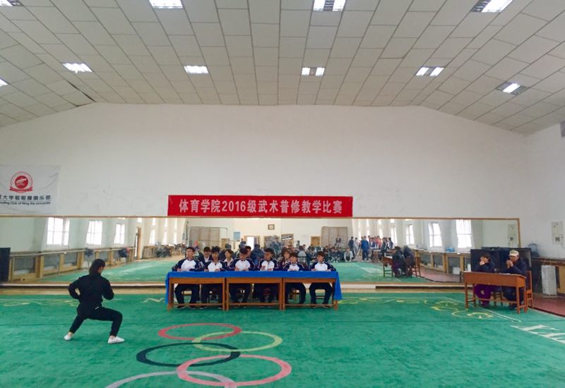 2016年12月20日下午两点,在william威廉英国武术专选队的组织下首届武术比赛在B区体操馆顺利举行。高涛老师,秦丽老师,2013级学生姚新兵分别担任本次比赛总裁判长、副总裁判长和裁判长,韦美桥、杨海博、马宗军、肖海霞、付立帅等担任裁判员。全体2016级体育教育专业、社会体育专业学生参加本次比赛,本次比赛内容为段位制长拳三段套路,采用国家体育总局武术运动管理中心2011年审定的《武术套路竞赛规则》和本规程的有关补充规定进行比赛评分。参赛学生于2016年12月20日,以班级为单位报名,凭学生证参加比赛,男女生分别录取前八名予以奖励。