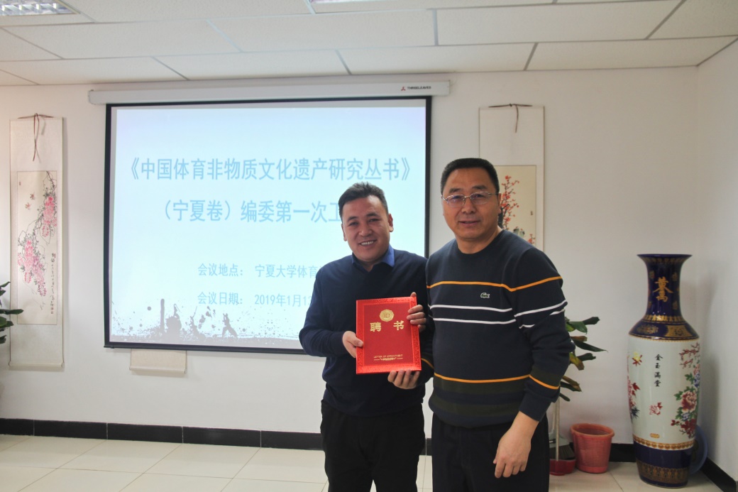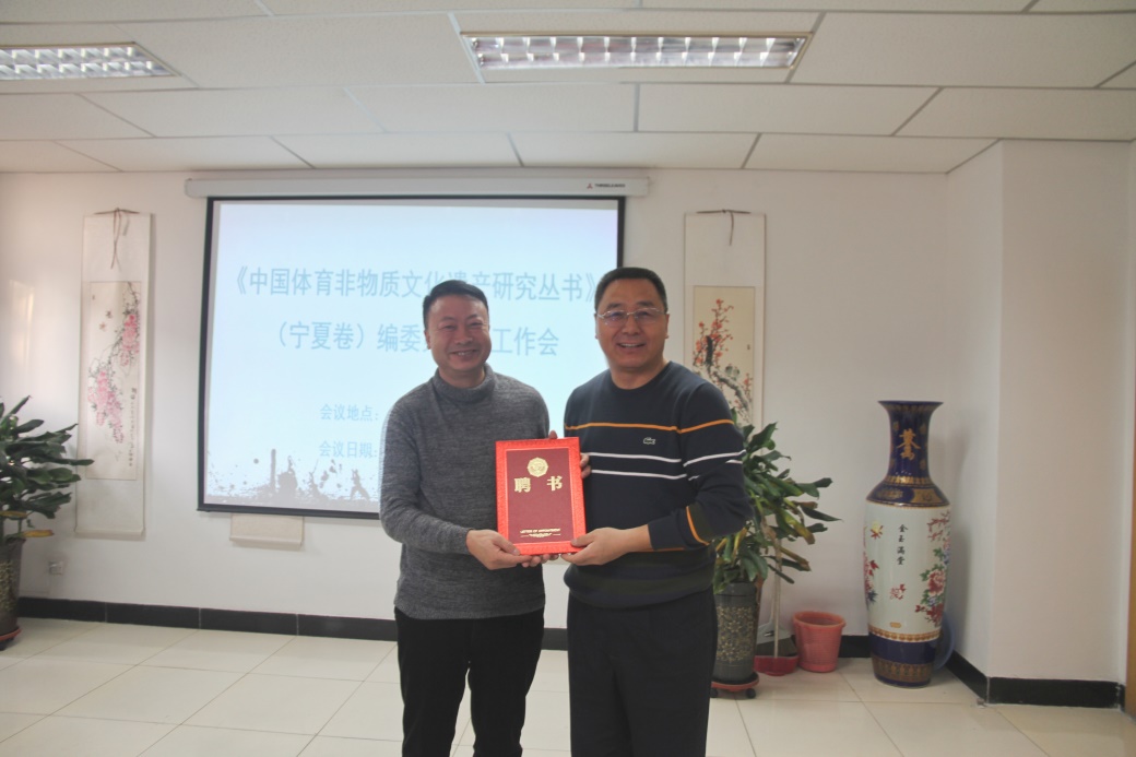 william威廉英国院长、《丛书(宁夏卷)》编写召集人咸云龙教授,针对《丛书(宁夏卷)》的写作背景、出版的目的意义进行了详细解读。同时对本书的撰写提出了要求,希望编委会成员勇挑宁夏体育事业发展和文化传承重担,发挥我院人力资源和专业优势,提高研究成果质量,为宁夏少数民族体育非物质文化挖掘传承,振兴中华民族文化做出应有的贡献。随后,《丛书(宁夏卷)》编写召集人咸云龙教授为编委会成员颁发聘书。