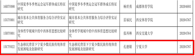 今日,全国哲学社会科学工作办公室共验收495个年度项目、青年项目和西部项目结项申请。经同行专家鉴定,398个项目予以结项;78个项目暂缓结项;19个项目被终止。我院孔德银老师《生态移民背景下宁夏少数民族传统体育发展困境及创新研究》项目已成功结题。
