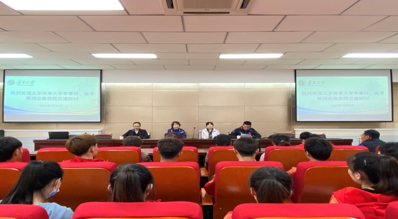 借助此次培训契机,4月24日下午,学院邀请北京体育大学李翠玲、张平两位专家在学院报告厅作“我要上全运”主题交流研讨活动。副院长徐赟,体操(健美操)、武术教研室(大学体育)全体教师及健美操队全体队员参加本次交流研讨活动,学院工会主席马艳军主持活动。