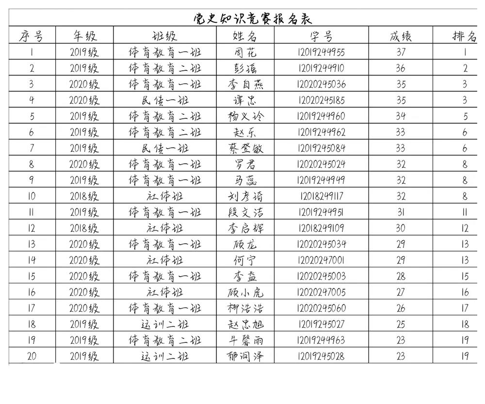 此次选拔考试是在700多道党史题库中,选出50道题作为考试题。在经过考试环节后,最终2019级体育教育1班周花同学、2019级体育教育2班彭瑶同学位列第1、2名,取得参加校级学生组竞赛的资格。