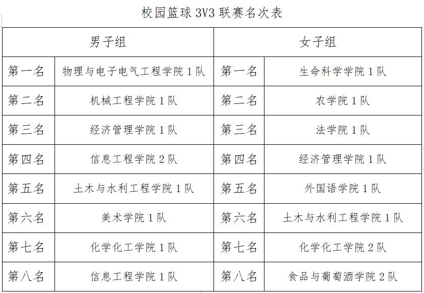 在稍早结束的校园3V3篮球联赛中,来自全校二十多个单位的男女共四十余支代表队,给全校师生呈现了一场篮球盛宴,提升了我校的篮球水平,丰富了校园篮球文化。物理与电子电气工程学院1队、机械工程学院1队、经济管理学院1队分获男子组冠、亚、季军,女子组前三名被生命科学学院1队、农学院1队、法学院1队夺得。