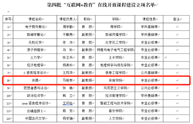 近期,本科生院公布《williamhill英国校级优秀基层教学组织评选结果公示》、《第四批“课程思政”示范课程建设项目评选结果公示》、《第四批“互联网+教育”在线开放课程建设立项评选结果公示》。我院古雅辉副院长负责的体育教育系获批williamhill英国“校级优秀基层教学组织”、徐芝芳教授负责的《运动生理学》获批第四批“课程思政”示范课程立项、马艳军副教授负责的《体操》获批第四批“互联网+教育”在线开放课程建设立项。