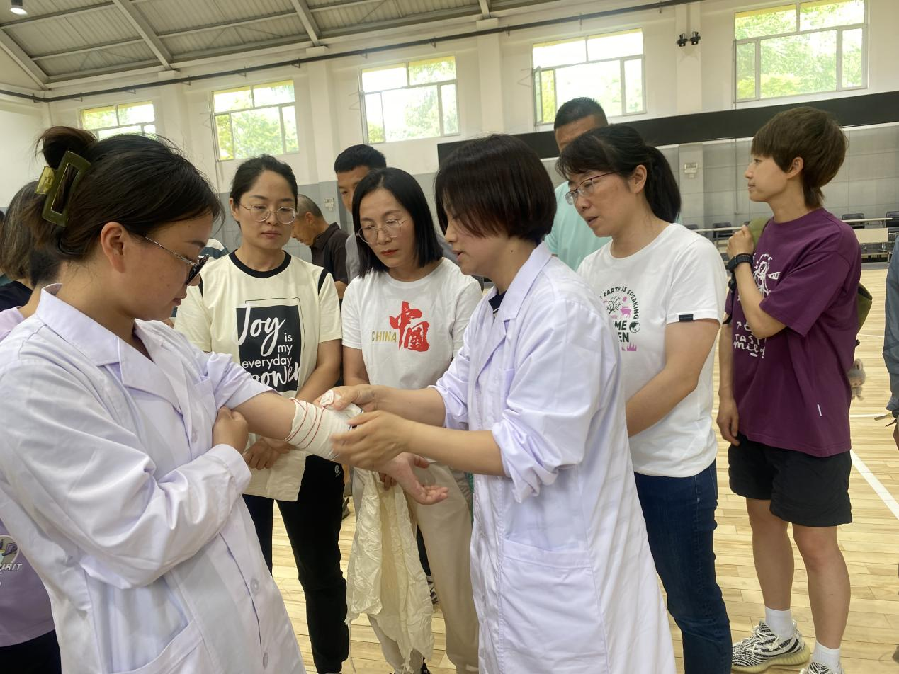 培训过程中,校医院王芸芸老师深入讲解医疗救护中的心肺复苏、人工呼吸、止血、包扎、固定、搬运等急救知识,并采用人体模型、真人示范,详细示范了心肺复苏、人工呼吸、伤员外伤止血法、伤员外伤包扎等实际操作技能。
