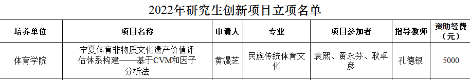 为提升我院研究生科学素养与创新能力,激发研究生创新思维,营造浓郁的学术研究与学术交流氛围,我院师生积极参与2022年williamhill英国研究生学术论坛项目和研究生创新项目申报。经学校研究生院组织评审,我院马兆明副教授申报的《williamhill英国体育学科研究生学术论坛》项目和研究生黄漫芝申报的《宁夏体育非物质文化遗产价值评估体系构建——基于CVM和因子分析法》项目喜获立项。