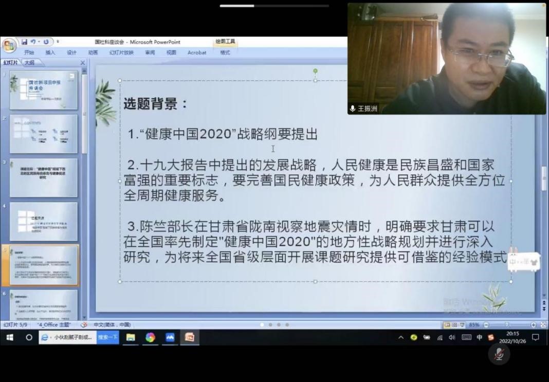 为切实做好2023年高层次课题申报工作,提高教师申报国家社科基金项目质量,凝练科学研究团队、总结申报成功经验,激发科研思想火花。10月26日晚,学院以线上形式召开2023年国家社科基金项目申报经验分享座谈会。会议邀请学院近年来获得国家社科基金项目立项的主持人李晓玲、万益民、孔德银、王振洲、虎晓东五位老师做专题报告。学院全体教师、硕士研究生参加会议,学院副院长马兆明主持会议。