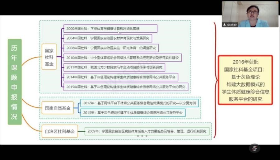 2016年国家社科基金一般项目主持人李晓玲教授:女,1965年生于宁夏中卫,教授,硕士生导师。主要研究方向:学校体育学,计算机在体育领域中的应用。长期从事高校体育教学与科研工作,尤其在学生体质测试、健美操教学训练领域积累了丰富的专业知识和研究经验。主持完成国家社会科学基金项目:“基于灰色理论构建大数据模式的学生体质健康综合信息服务平台的研究”,主持、参与自治区哲学社会科学课题3项,主持williamhill英国科研课题3项,指导国家级大学生创新课题2项。主编教材1部,参编2部,公开发表学术论文10余篇。获第十届宁夏自然科学优秀学术论文二等奖、宁夏第十二届社会科学优秀成果三等奖、宁夏首届优秀教育科研成果二等奖、第十二届全国高校田径科研论文报告会一等奖等。
