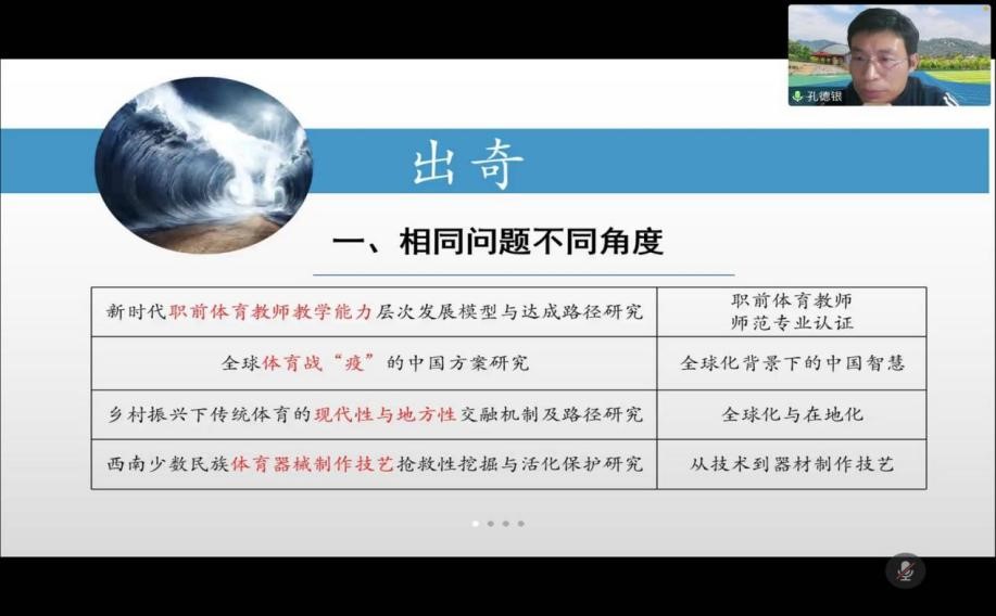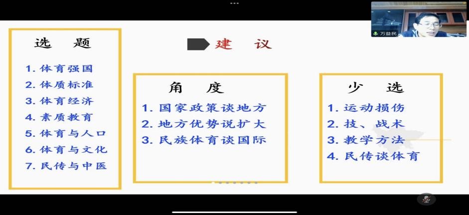 孔德银副教授主要对申报书的选题领域与题目界定进行漫谈,他认为科研选题一要“守正”,即要立足体育学科、发挥自身优势、关注前沿动态;二要“出奇”,即相同问题要找不同角度、学科要进行交叉与融合、表述技巧坚持巧妙描述,突出追求选题的三境界“高、新、奇”。