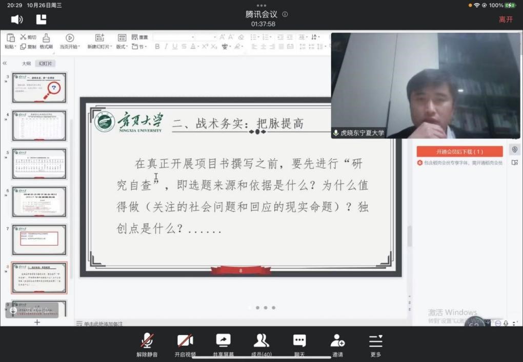 虎晓东博士根据个人立项国家社科基金项目的具体实例,详细阐述了研究选题确定前的准备工作、项目书撰写过程的凝练与打磨。从战略务虚:做好第一调查,到战略务实:把脉提高。他提出要在申报准备上下功夫,不打无准备之仗,申报课题前要充分了解近五年国家社科基金项目立项情况,并从中提炼出研究热点问题。同时项目申报要发挥团队优势,接受同行和评审专家意见,反复修改打磨。