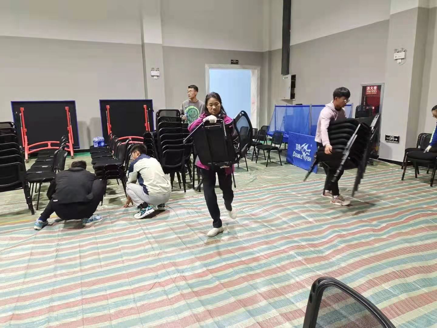 在第一天新冠疫苗接种工作结束后,场地工作人员发现由于人员流动大,场馆地面损坏的可能性较大,并且经过一天的疫苗接种工作,场地卫生条件已无法满足第二天疫苗接种的需要。为了给第二天的疫苗接种干工作提供更加卫生、舒适的场地,学院场馆服务团队积极作为、有需跟进,学生功能党小组也积极参与其中,大家主动放弃休息时间,晚上十点还奋斗在一线——铺设地板防护罩,清理场地卫生,重新摆放观察区的座椅。