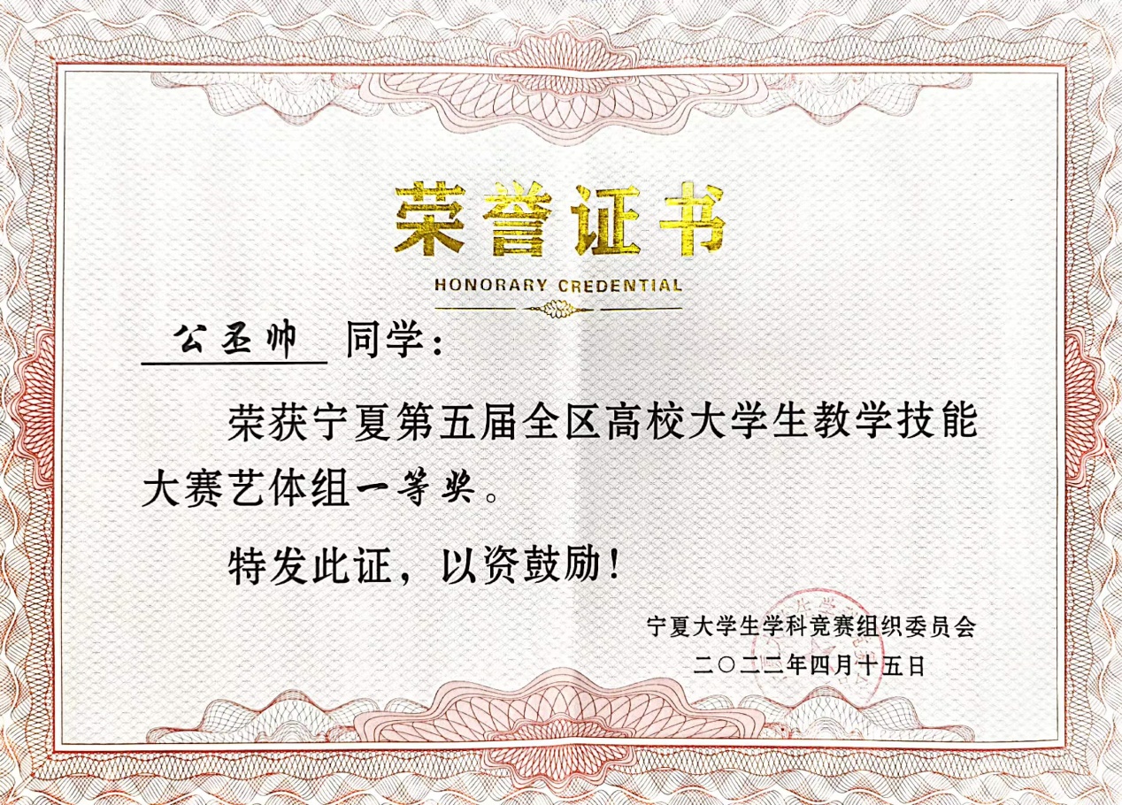 公丕帅同学在各位老师的精心指导下,全身心投入,认真备赛,发扬“自强不息 奋勇争先”的求是精神,在比赛前后充分备战、积极应战、迎接挑战,最终取得了艺体组第一名的优异成绩。希望同学们能够向公丕帅同学学习,持续提升教学技能水平,在今后的竞赛中再创佳绩。