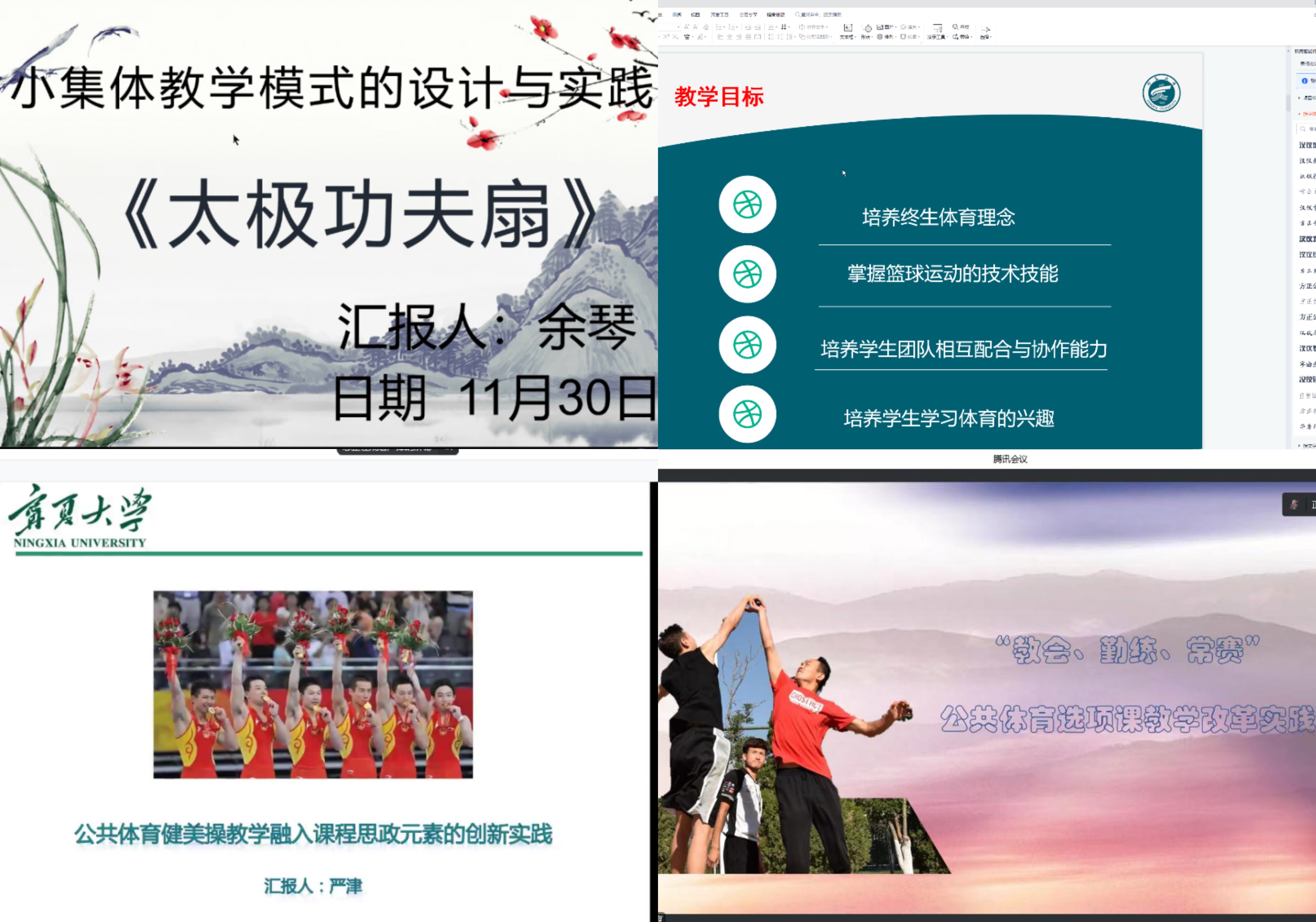11月30日,大学体育部举行了系部预赛,此次比赛,所有教师展现了积极向上的精神风貌,取得了良好的效果;评委老师们也分别对每位参赛教师进行了精彩点评,使全体教师受益匪浅。最终经过评委评议,推荐严津和余琴两位老师参加正高组和中级及以下组的院级比赛。