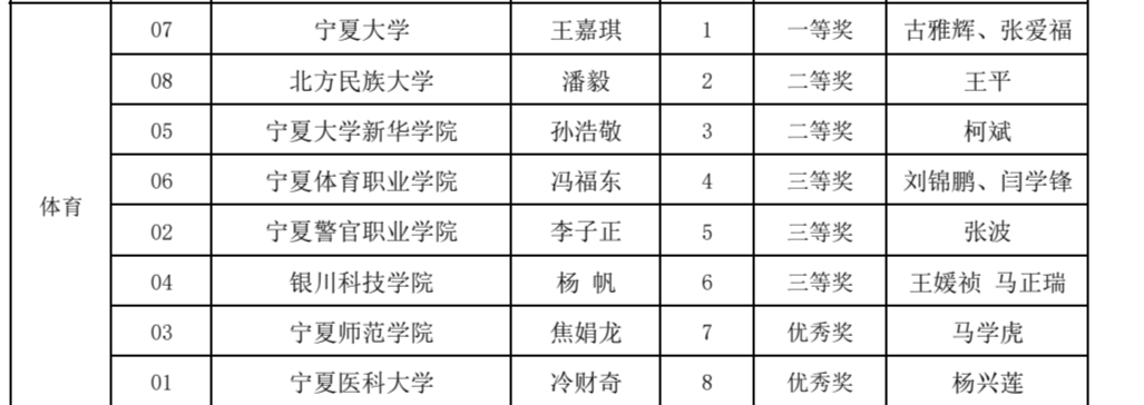 为进一步培养大学生教师职业意识、促进大学生教学技能提升,11月24日-11月26日,由自治区教育厅主办、宁夏师范学院承办的第七届全区高校大学生教学技能大赛在宁夏师范学院举行。本次比赛共有来自全区8所高校的151名选手同场竞技,经过激烈角逐,我院王嘉琪同学荣获艺体幼组(体育)学科一等奖。