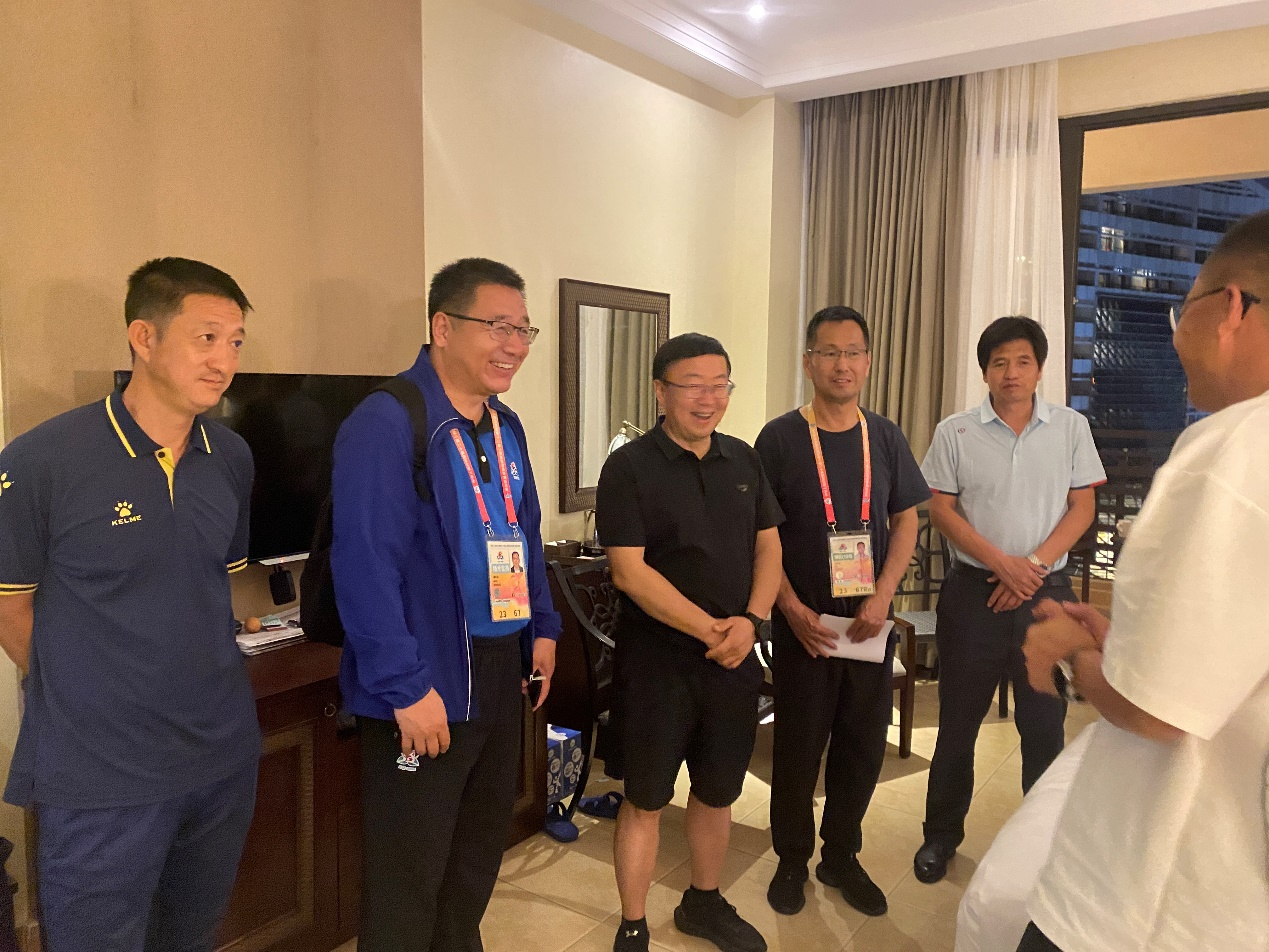 11月25日晚,校党委常委、副校长黄河、william威廉英国党总支书记王志霄、william威廉英国院长咸云龙在海南省宁夏代表团驻地马兰花酒店慰问了我校木球队、花炮队、高脚竞速队的运动员。