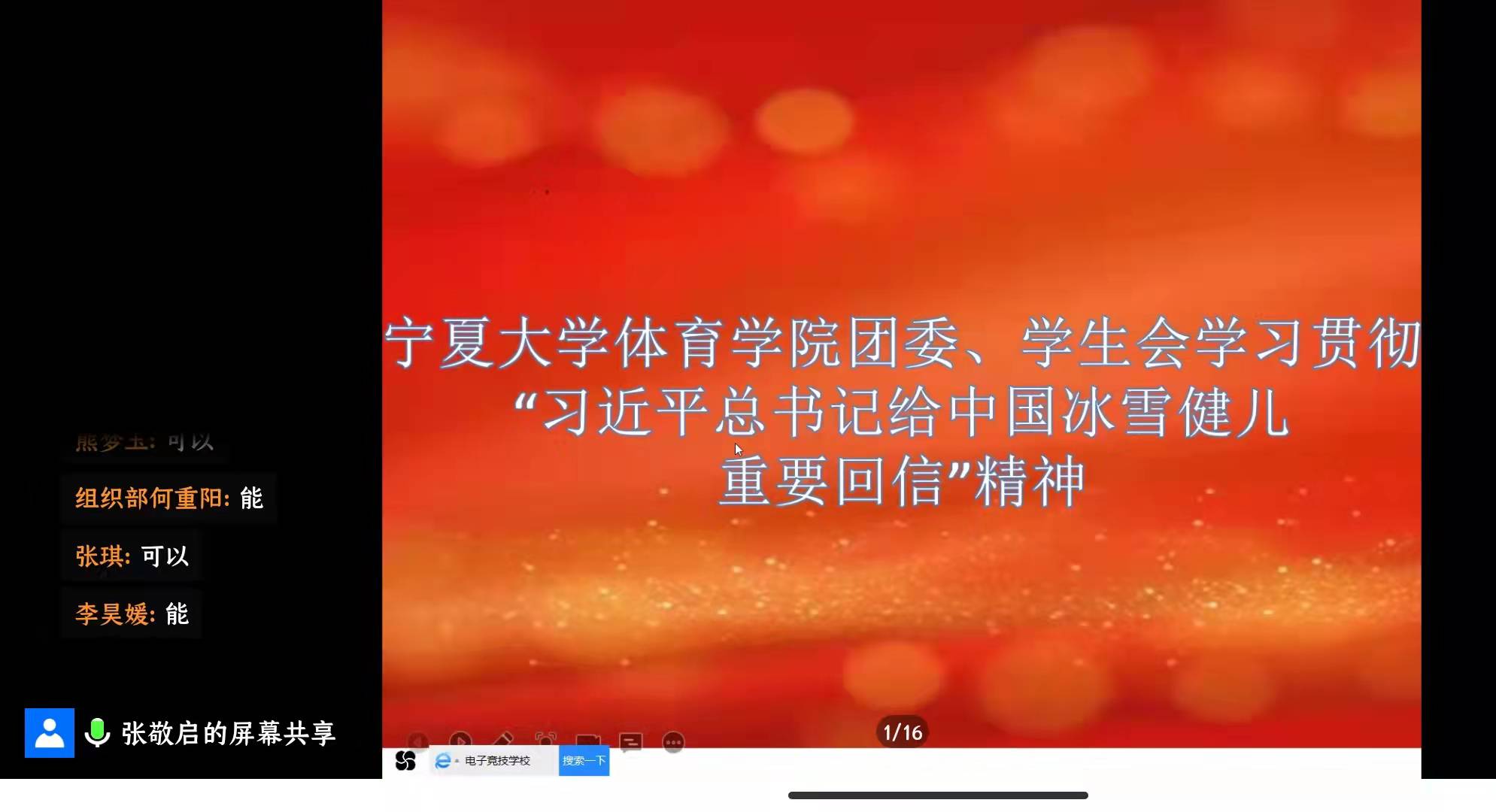 为全面贯彻落实“习近平总书记给中国冰雪健儿重要回信”精神,3月21日,我团支部以线上会议的形式开展学习“习近平总书记给冰雪健儿的重要回信”精神为主题的团日活动,团支部全体成员参加,活动由团支部书记肖彤同学主持。