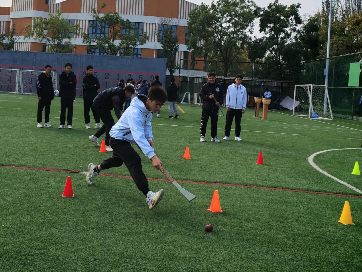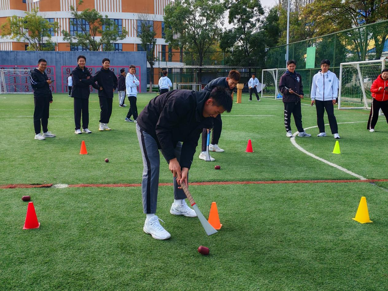 参与木球比赛的体院学子手拿球杆,聚精会神在障碍物中穿梭奔跑,发挥出自己的技术和实力,木球滚滚向前直奔门区,精彩的表现引起大家的阵阵喝彩。