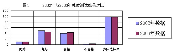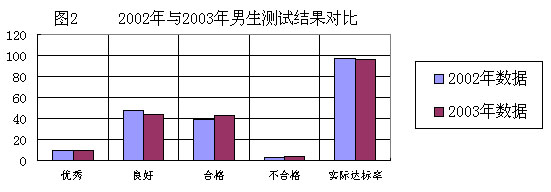 从图1看出,2003年与2002年相比,全校学生优秀人数略有增长,良好人数有下降趋势,合格人数有所上升,不合格人数也有所上升,表现出实际达标率有所下降,这表明2003年学生的总体体质呈下降趋势。