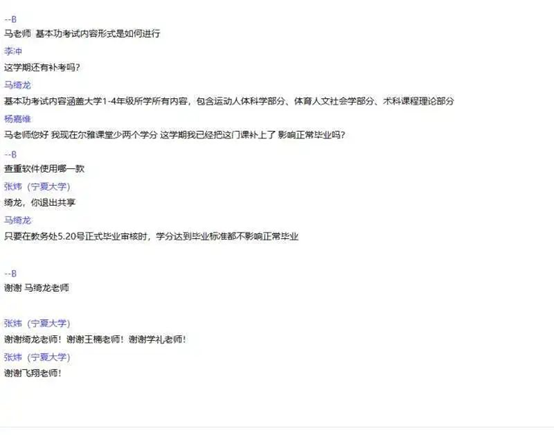 随后,马绮龙老师通过共享屏幕的方式为2020届学生详细解读了毕业课程审核工作;王楠、秦学礼老师为同学们解答了撰写毕业论文、网络查重及线上论文答辩过程中存在的难、疑点问题。张炜副院长就毕业前期各项课程考核及论文撰写注意事项作总结发言,并预祝大家毕业顺利。江伟副书记强调现阶段同学们要严格按照学校有关要求,认真做好疫情防控工作,并就毕业、就业等重要内容作了全面细致的部署。
