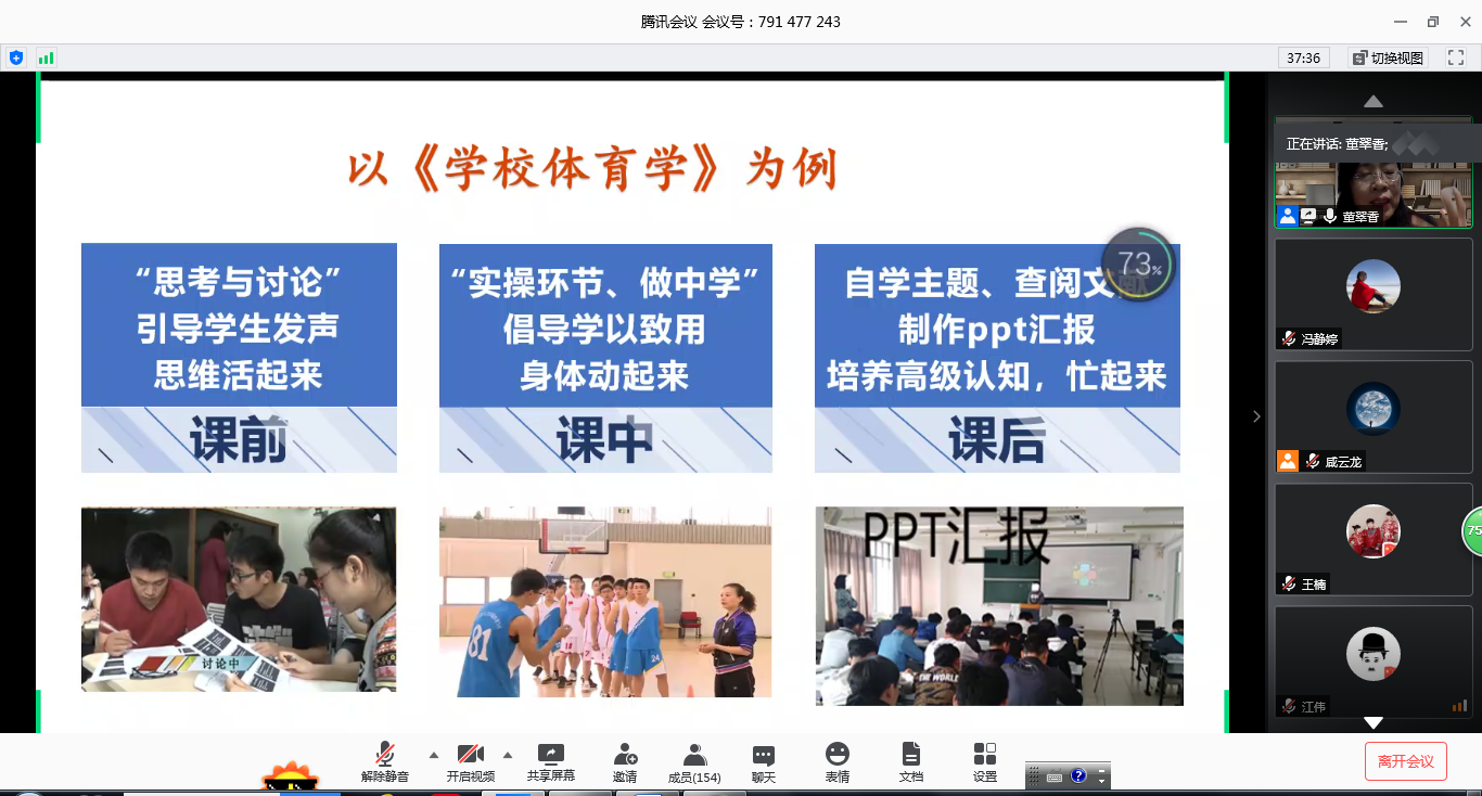 最后,董教授在线与大家进行了互动交流。就体教融合理念对体育教师的要求、教师教育如何培养专业素养、新教学理念与传统教学的关系、如何引领学生主动学习等问题进行了深入交流、细致讨论,董教授的耐心解答和悉心指导为青年教师更好地备战教学基本功大赛提供了思路,指明了方向。